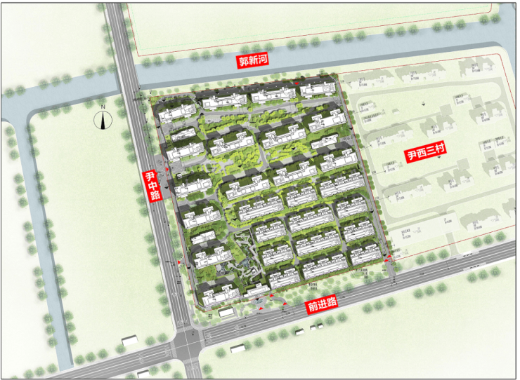 北面是郭新河,东面是尹西三村,南面是前进路,西面是尹中路。