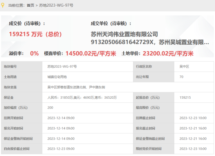 山湖颂,即,苏地2023-WG-97号,位于吴中区郭巷街道东进路北侧、尹中路东侧,城镇住宅用地,占地面积68627.09平,是2023年12月23日,天鸿伟业&吴城置业以底价159215万元竞得,成交楼面价14500元/平。