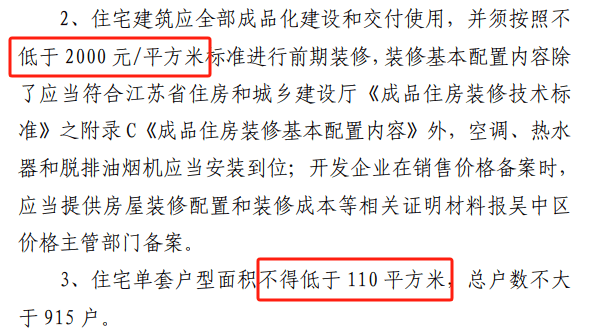 3,根据地块出让要求:住宅部分装修交付,装标不低于2000元/㎡,住宅户型不小于110㎡。