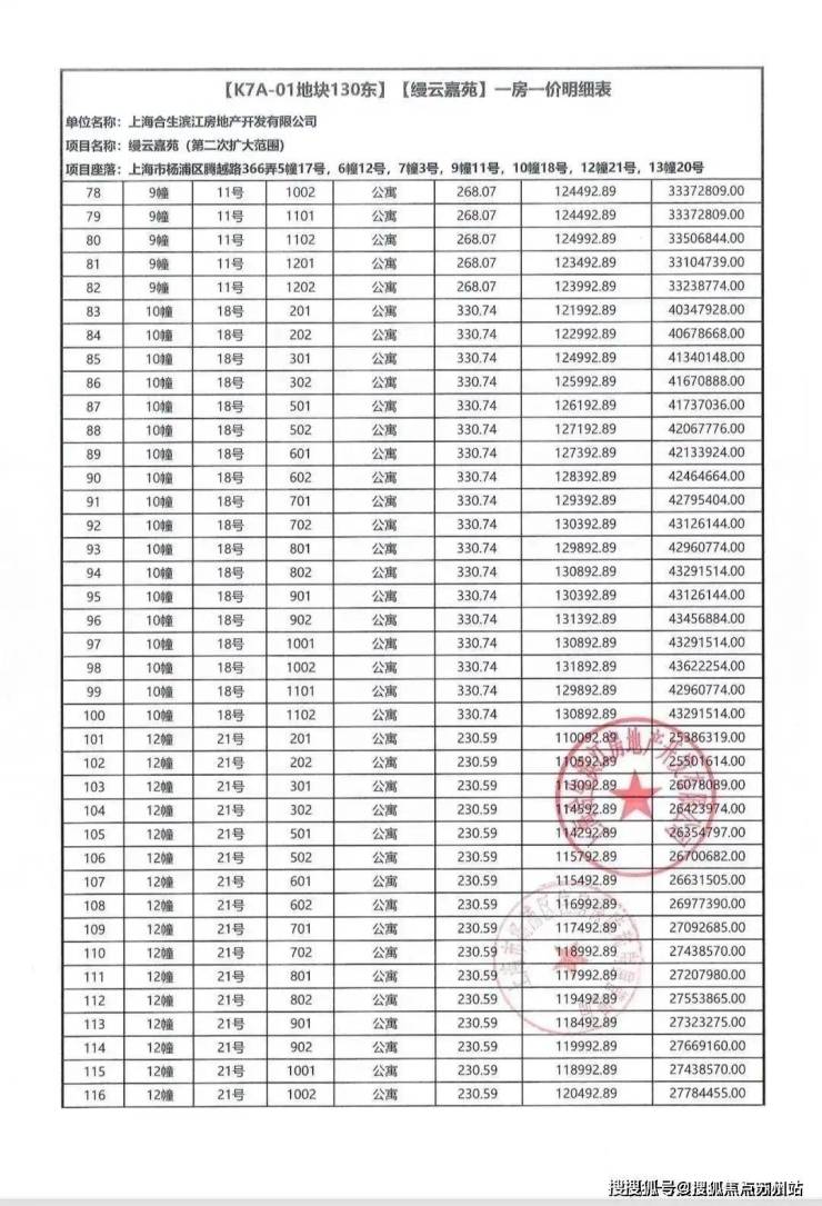 一房一价表如下