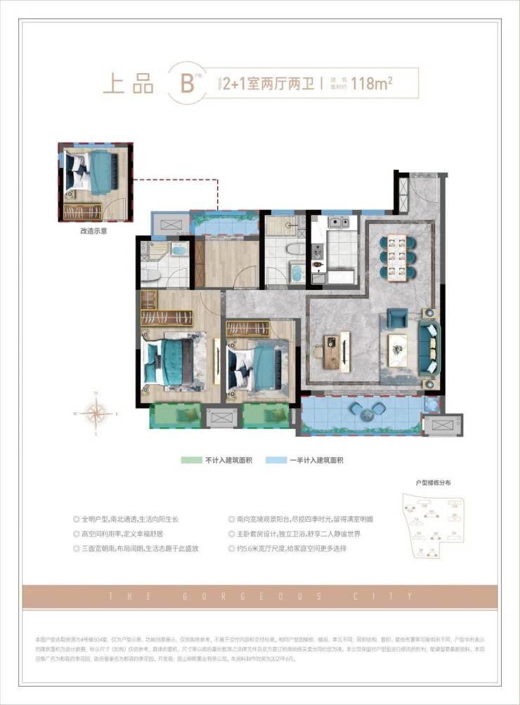 三开间朝南明朗格局,2+1灵动配置空间,成功避免“家庭早高峰”的双卫格局,搭配独立卫浴、衣帽间的主卧套房,让年轻一样可以奢享。