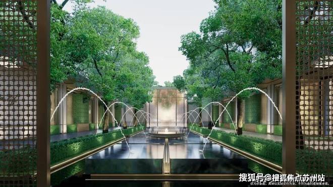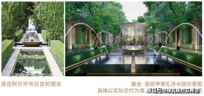 园林内的礼序水源以世界奇迹西班牙艺术瑰宝阿尔罕布拉宫作为灵感的来源,吸取了经典的跳泉、修剪绿篱、水晶花房、蓝翡翠奢石等元素构建了以水轴为主的仪式感的庭院空间。