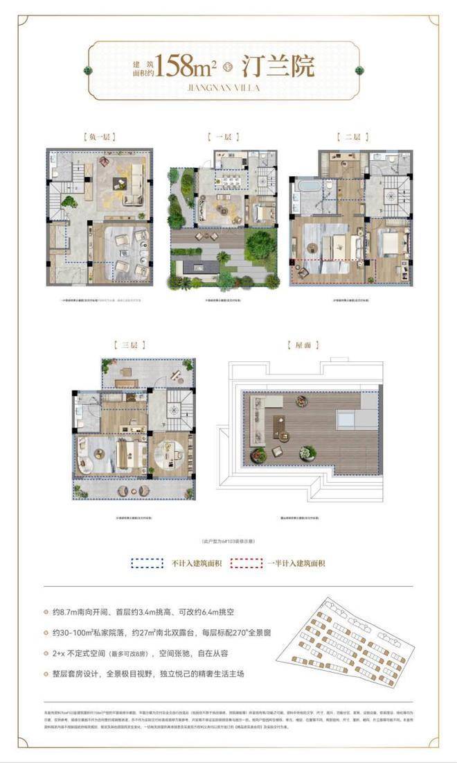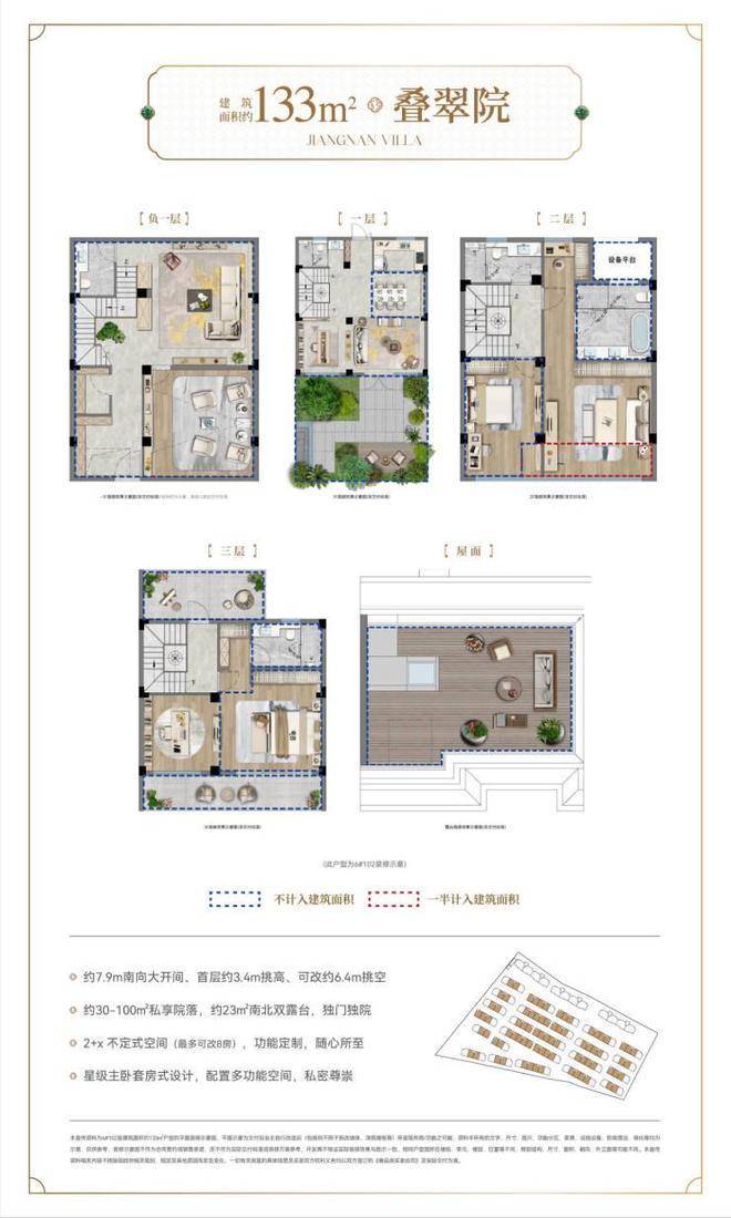 联排别墅:面积133-158㎡,共25栋3层建筑,首层挑空3.4米,二、三层层高3米,总价268万起,得房率超245%1