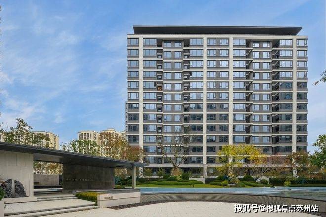 在楼栋主入口同样运用石材+弧形铝板等元素,同时还有格栅装饰,质感提升明显:招商臻境