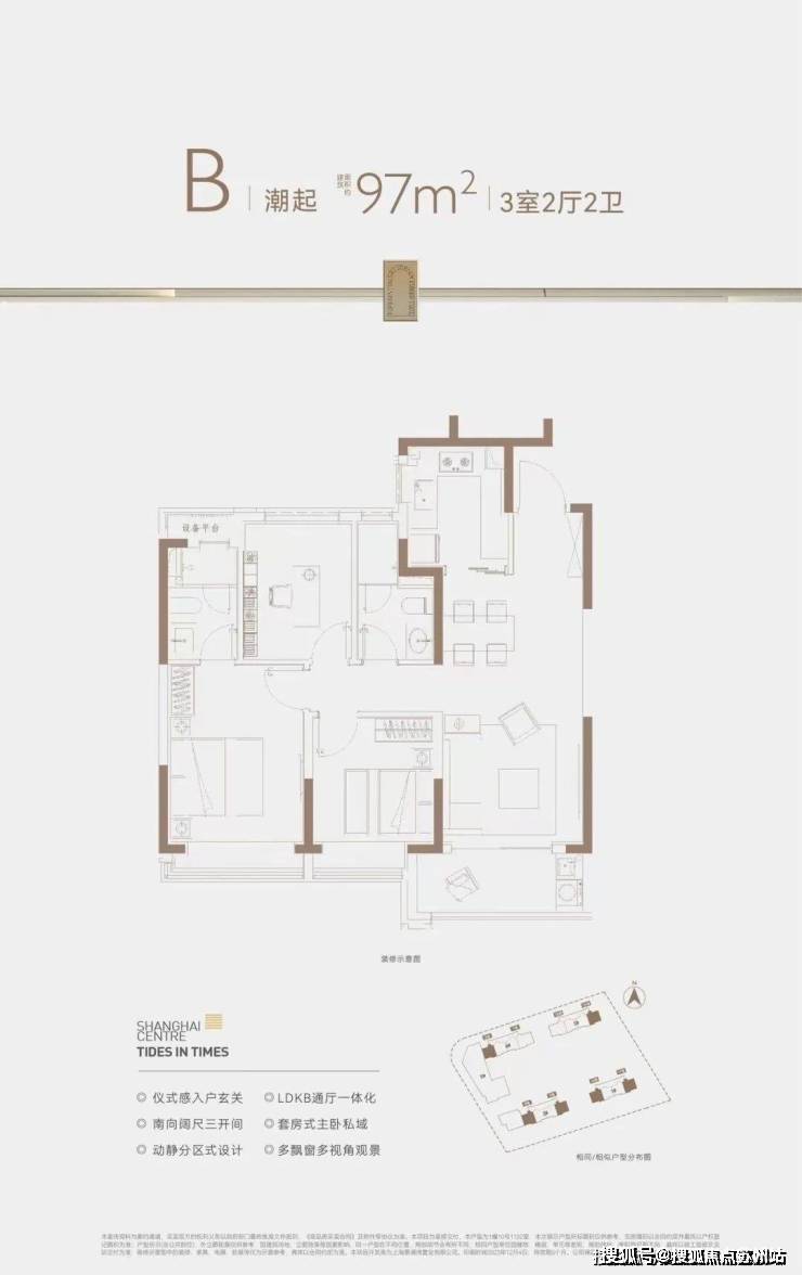 在格局上,户型三开间朝南+动静分离,室内通风、私密性俱佳。