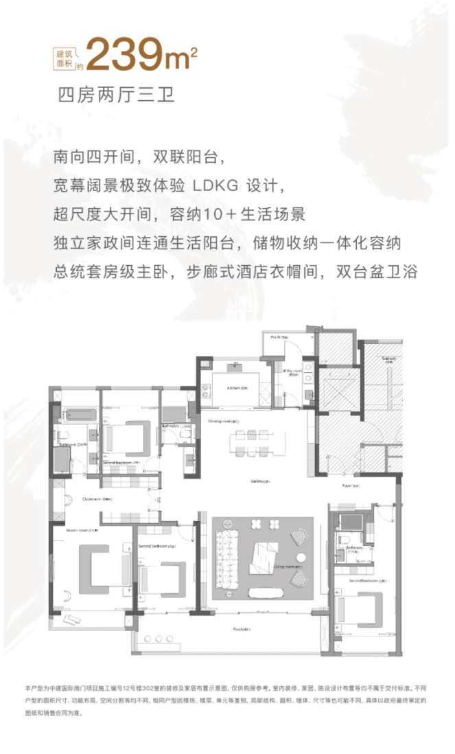 建面约239㎡:这就是终极改善了。南向四开间搭配双联阳台,视野无敌。客厅开间巨大,能玩出十几种生活场景。主卧是总统套房规格,带步入式衣帽间和双台盆浴室,私密性和奢华感拉满。这无疑是苏州高端住宅市场中的标杆级产品。