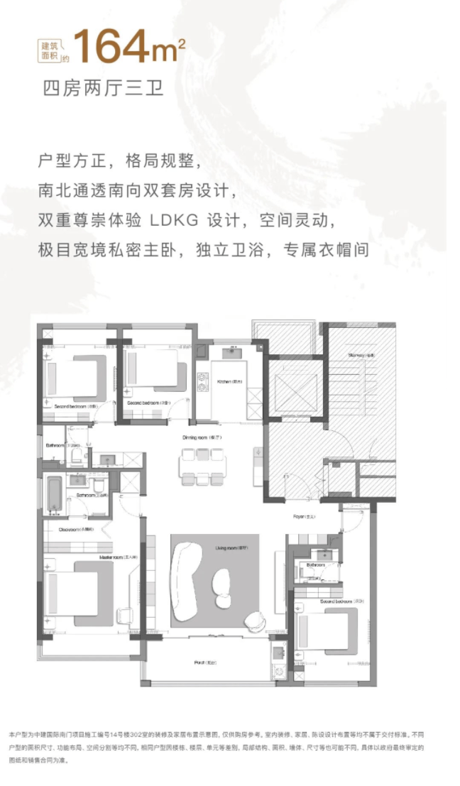 建面约164㎡:户型方方正正,南北通透。亮点是南向做了两个套房,主客都尊贵。客厅餐厅厨房阳台连成一片,空间显大又明亮。这个四房户型是追求功能与舒适平衡的优选。