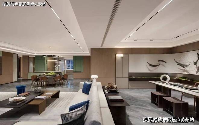 东区建面约320户型,将艺术感进一步融入日常中。特别设计的专属门厅空间,是从电梯厅延伸到家,如同一处艺廊,放慢人的情绪;室内选用了浅金色奢石(外界也称其为“芬迪白大理石”)作为主要的石材,曲面的木饰面也为浅色,整体给人以明亮感。