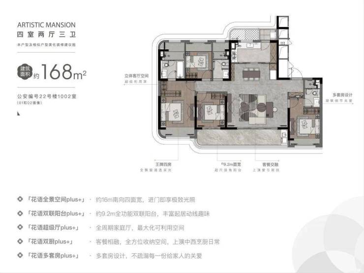 168㎡四房三卫,双套房设计,适合三代同堂;
