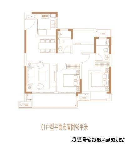 建面约98㎡3房2厅2卫: