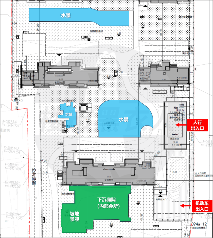从规划图来看,社区内部广泛运用水景:共有2处大型集中水景+1处宅间水景,周边还有下沉庭院+坡地景观,大概率此处未来社区会所的位置。值得一提的是,项目的楼间距全部在35米以上,最大楼间距达到了约51.2米。