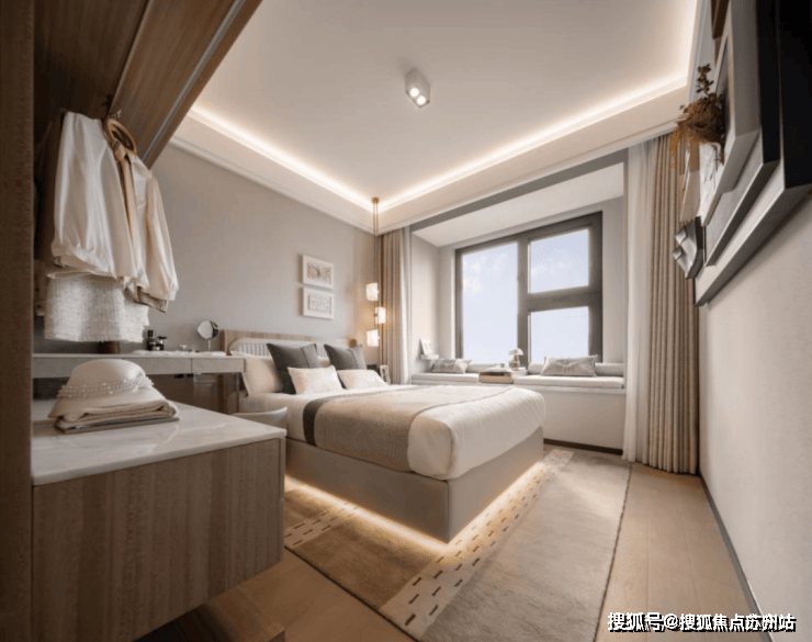 主卧软装家具都做了标准尺寸,剩下的过道空间如图所示也并不是很窄,还是比较良心的!主卧玻璃采用了三玻两腔中置百叶窗,气密性更好。