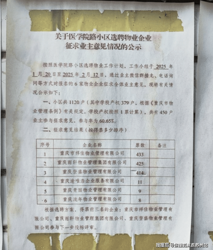 小区总共1120户,有450户业主参与征求意见,得票前三的祥佳、雨轩、登盛晋级下一步投标评审。