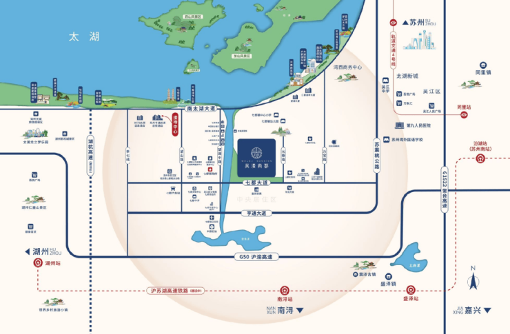 【住在哪里?地段配套怎么样?】 吴溇尚都的位置相当好,就在七都镇府旁边,属于正核心地段。最大的亮点是离太湖特别近,大约1公里就能走到南岸,平时散步看湖景太惬意了。生活在这里,既能享受小镇的宁静与便利,又能坐拥一线湖景资源,是典型的“出则繁华,入则宁静”。