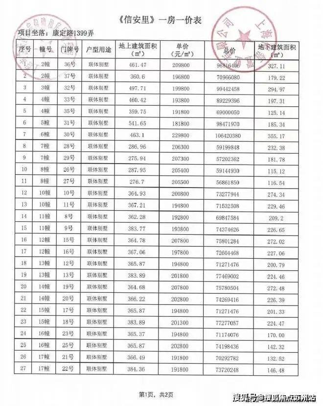 一房一价表如下