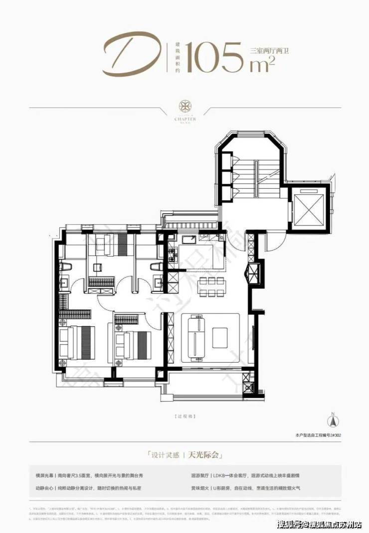 餐客厅采用少见的方厅设计,搭配1.5面宽长阳台,彰显气派,这在百平产品中极难遇到。