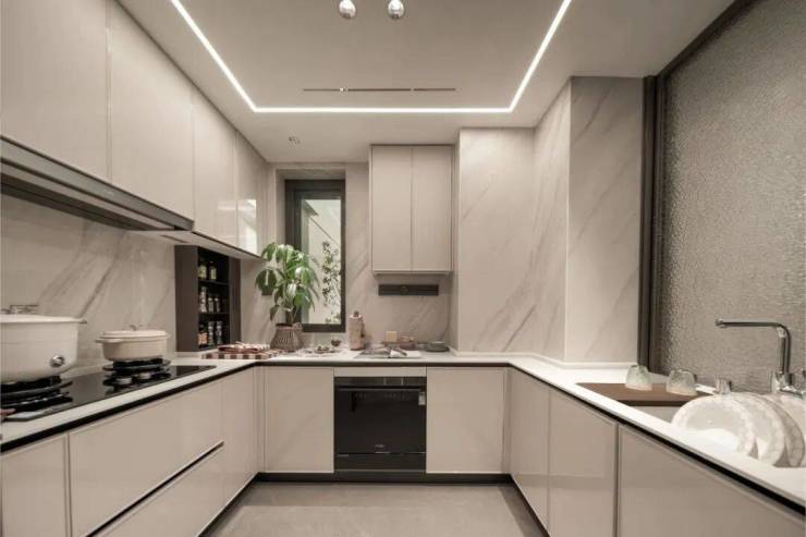 除了户型尺度,招商序的展示空间用料也是在700万这个量级难逢敌手,整个展示空间,除了卧室的拼花地板,其他区域的地面与墙面几乎全是岩板与奢石。连卫生间墙面都做到了岩板通铺....这种用料一般只有千万级的豪宅才能看到,114的客厅背景墙也采用了天然大理石搭配岩板交付,岩板因工艺复杂、性能优异,多用于高端场景,招商序厨房、卫生间墙面地面,客餐厅地面连通阳台,全部通铺岩板,可见硬装投入度之高。