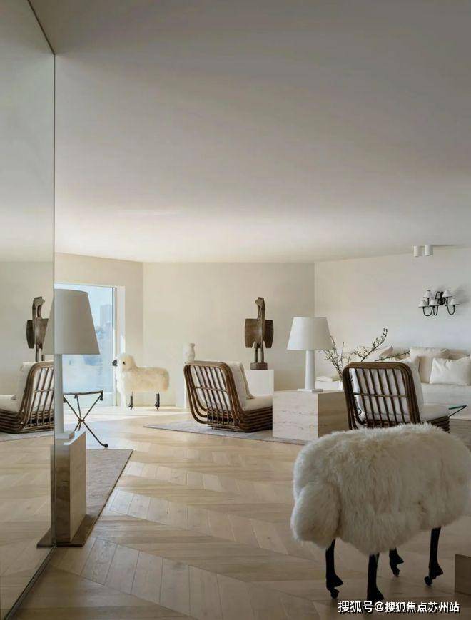 地面满铺着鱼骨拼木地板,独特的拼接方式增加了空间的层次感和立体感。大白墙简洁干净,为整个空间奠定了明亮的基调。平顶天花设计简约大方,没有过多的装饰,却展现出一种简约而不简单的美感。