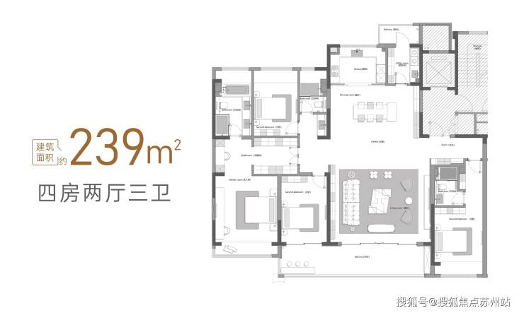 四居室户型:面积约239㎡,四室两厅三卫,适合多人口家庭。主卧带独立衣帽间和卫生间,生活便利;次卧与书房相连,方便工作学习。