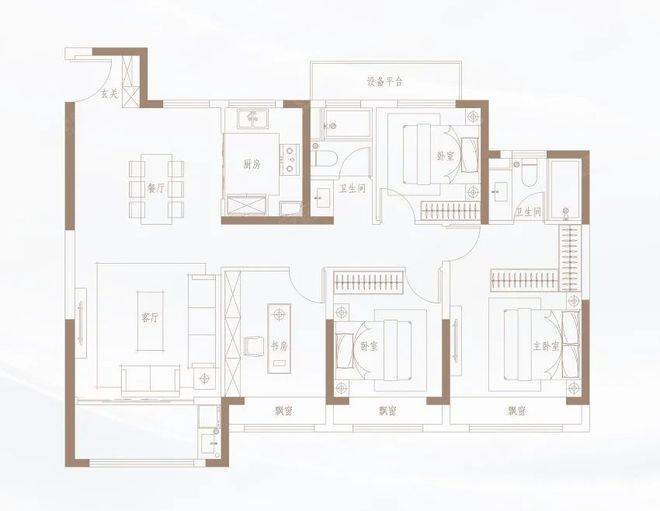 138㎡户型开间阔绰,4室2厅2卫,三房朝南,均赠送飘窗。