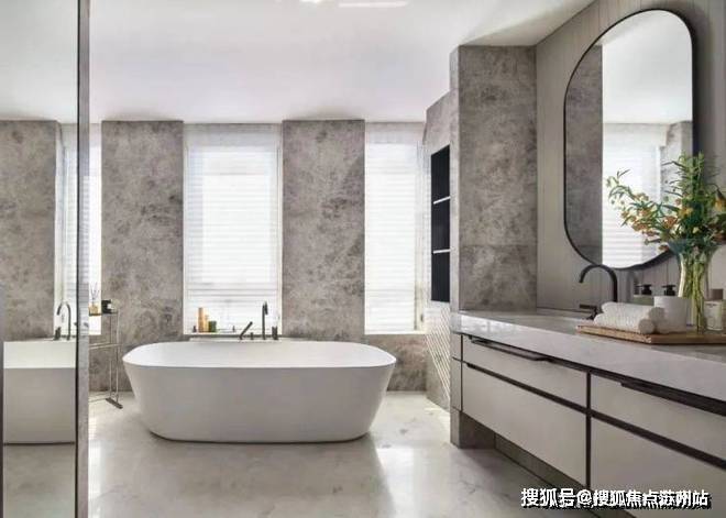 主卧的浴室通过大面积的开窗来将光线引入室内,纯白色的浴缸与大理石墙壁相对应,突出艺术性、时尚感,场景不在遵循传统意义上的布局。