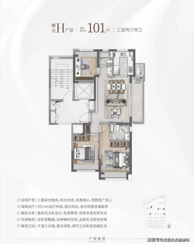 ③建面约101㎡H户型:三面采光,全能景观王炸边厅户型!