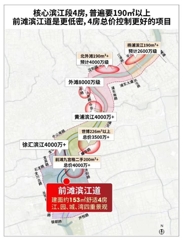 事实上,放眼核心滨江段,能同时满足“控总价+直线距离黄浦江约500米+舒适瞰江4房”,其实只有前滩滨江道,年末高端改善,盯牢它就行了,无需看其它。