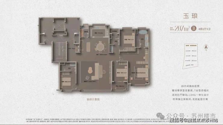 建面约207㎡四房两厅三卫:LDKG一体化设计,巨大的公共空间,气场十足,四开间朝南,采光视野极佳,南向双套房设计进一步提升居住舒适度。