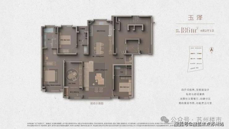 建面约186㎡四房两厅三卫:动静分离设计,三卧室朝南,双套房设计,主卧套房空间宽敞舒适。
