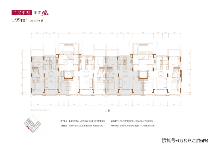 2、从内部空间体系来看,地上三层,层高分别是3.6米、3.3米和3.3米;每个单元一梯两户,每户均拥有类独立电梯厅;一楼带地下室及庭院,并通过创新退台式设计为二楼和三楼打造私家空中花园,形成户户有花园的墅居生活方式。