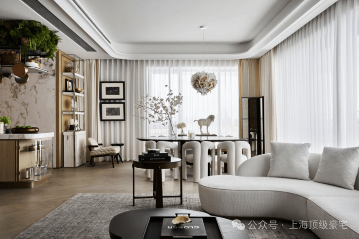 客厅空间采用大量造价昂贵的弧面设计,带来更有格调的审美价值:
