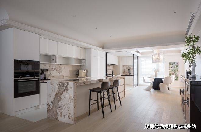 原餐厅区域作为中转区,增设了3米左右的互动式西厨岛台,充足的收纳和操作台面让空间的合理利用与简洁有序相得益彰。