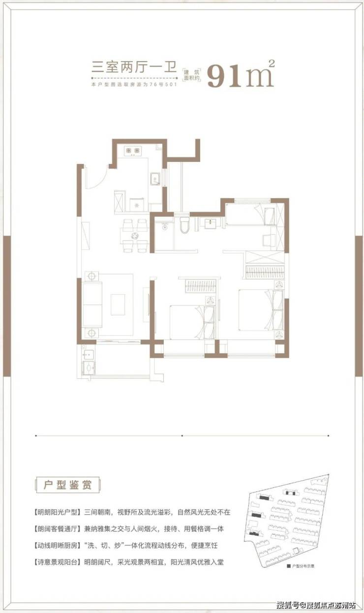 建面约91㎡3房2厅1卫户型,做到了三开间朝南+双朝南卧室带飘窗+动静分离+卫生间干湿分离,采光面拉到极致的小3房户型。