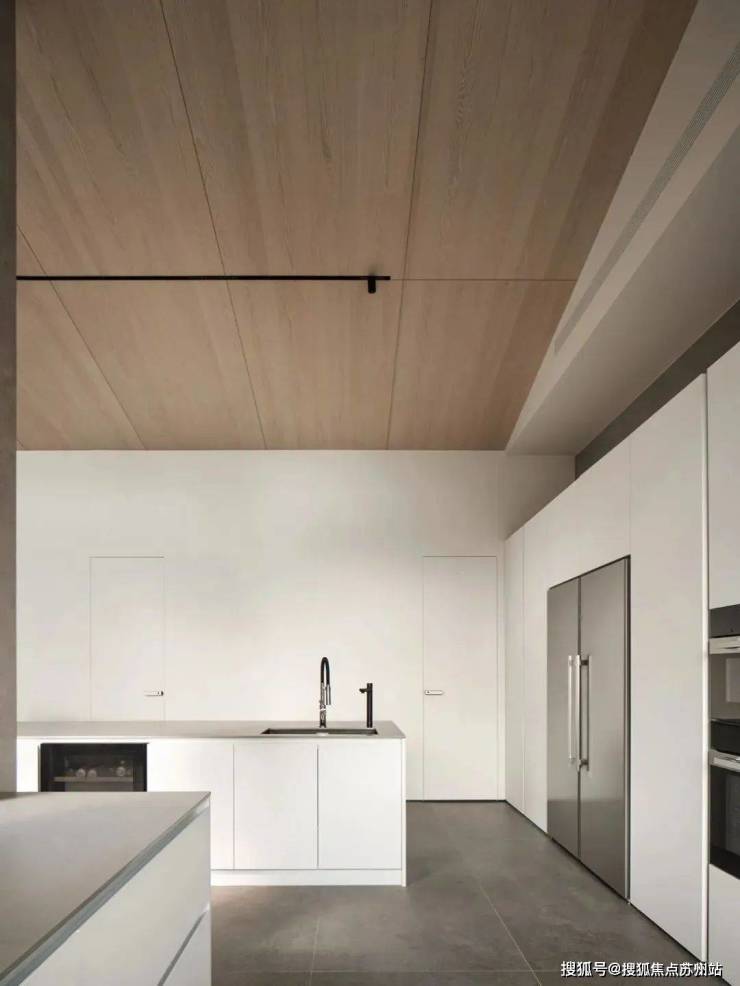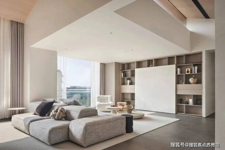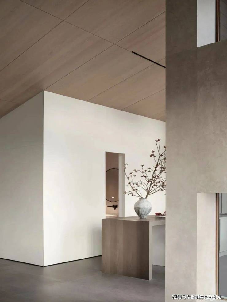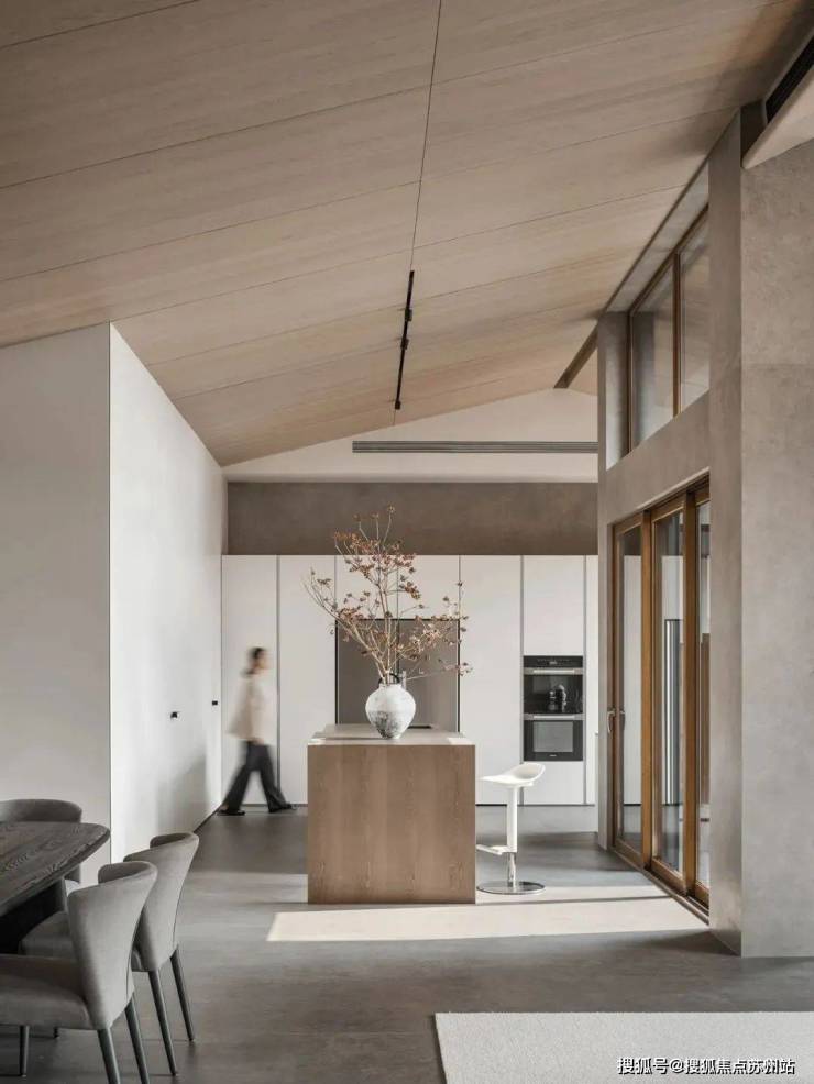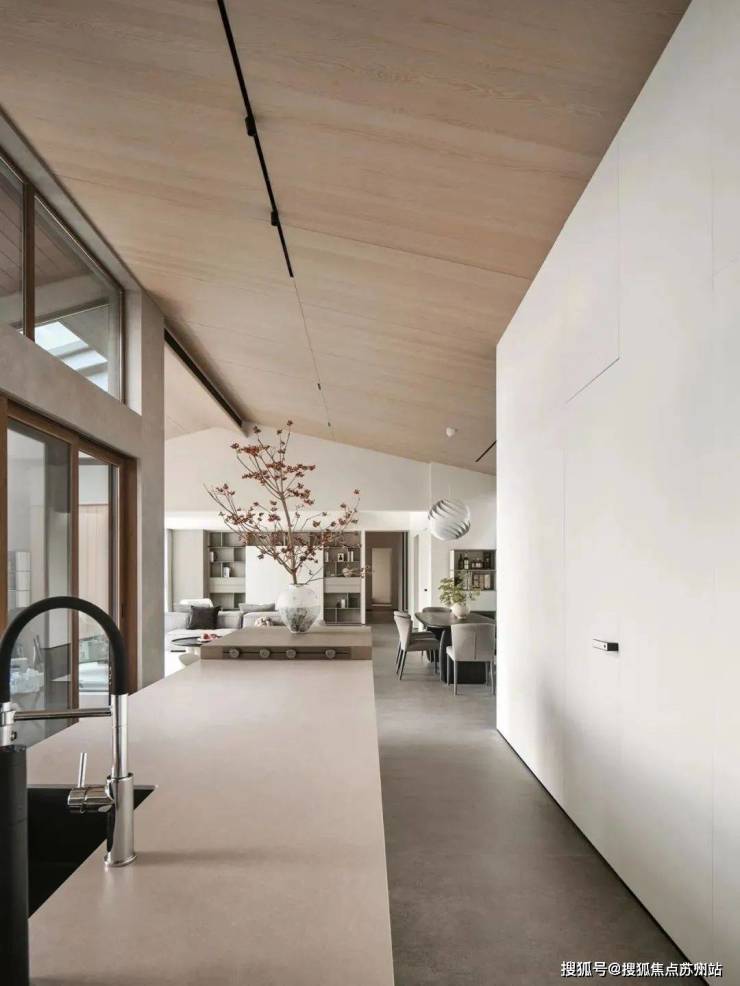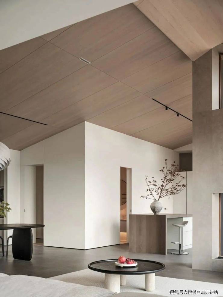 倾斜的吊顶和特意做出的错落 “断层”,增强了空间的纵深感。这种感觉不是来自单一方向,而是四面八方的张力共同形成的。