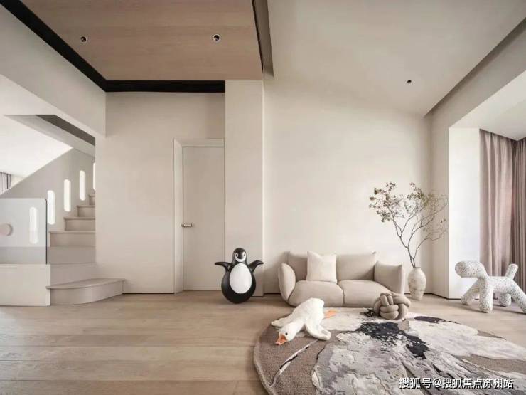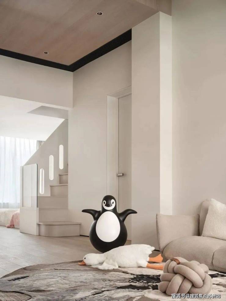 在起居室的另一边,地板上到处都是孩子的玩具,像企鹅、大鹅、小狗之类的,充满了自由活泼的氛围。对孩子来说,这里不只是起居室,还是和父母一起玩的乐园,是可以随便探索玩耍的地方,像动物园和游乐场一样。