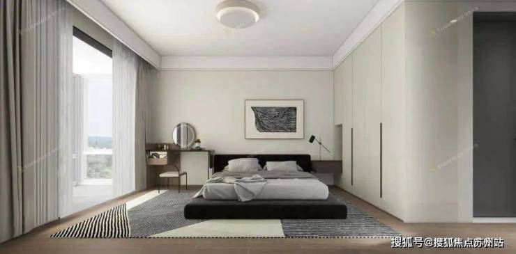 温馨纯净是主卧给人的第一感觉,暖暖的奶茶色+淡雅的白色基调延续了苏州园区建屋海德公园售楼处电话☎:400-8123-664✔✔【预约热线】整体的简单色系,充斥着没有杂质的美好,赋予空间自由整体性和舒适宁静感。床头用简单的艺术画进行装饰,使得整个空间不失艺术感。床头一侧垂落着台灯,圆润优雅的造型营造出灵动的室内氛围,在每一个夜晚绽放明亮柔和的光芒,伴着居者入眠。
