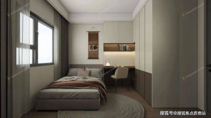 苏州园区建屋海德公园售楼处电话☎:400-8123-664✔✔【预约热线】另一间次卧的设计以简单实用为主,造型干净的顶面与墙面,暖咖色床体铺设出淡雅柔和的自然空间。床侧采用了书桌和大衣柜一体的设计,避免了大面积柜体带来的厚重感,与不同的色彩组合,创造出一种和谐的美学秩序,极大地提升家居格调与生活的仪式感。