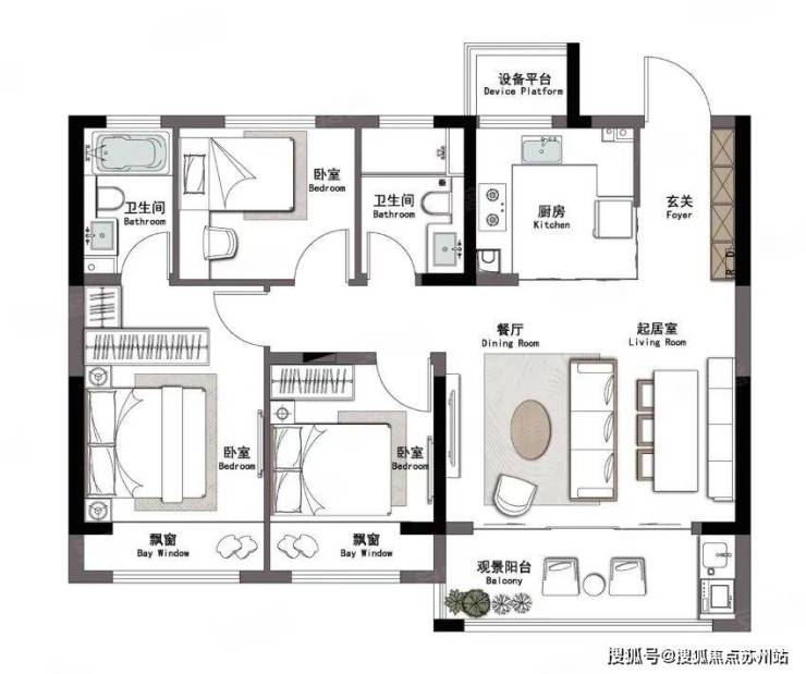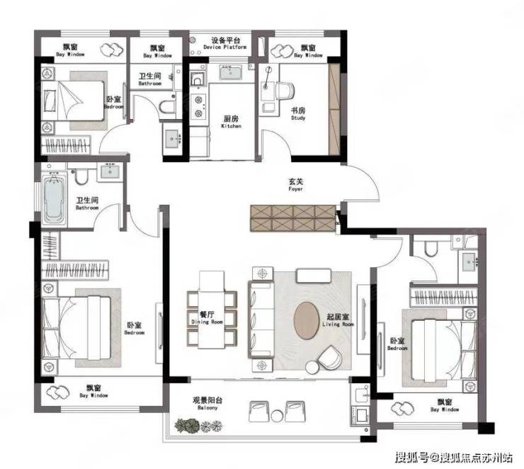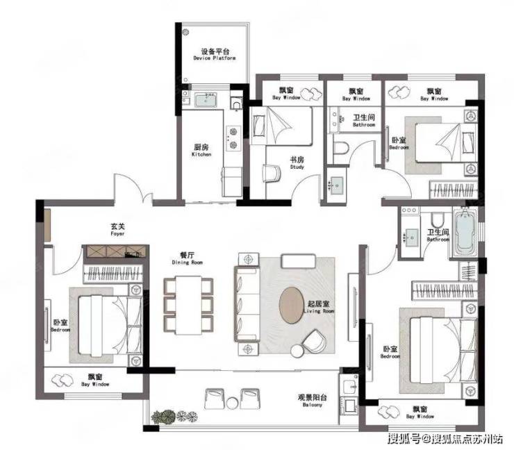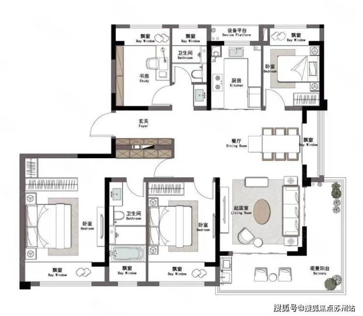 也是3房2卫,南向客厅+餐厅的横厅设计,双卧朝南,整体设计也比较合理。客卫部分空间小了点,不过也做了干湿分离!每个房间也都做了飘窗,对室内空间有个延伸!