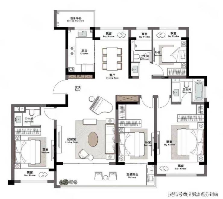 主卧带大衣帽间和明卫,南次卧带内卫。同样是多飘窗设计,客卫干湿分离!