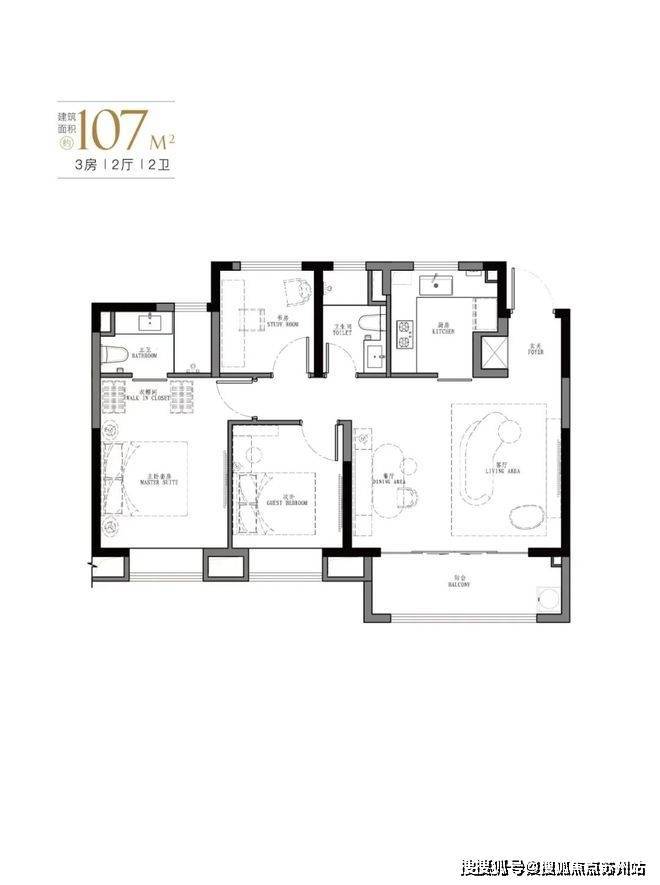 产品:103㎡、107㎡的三房两厅两卫及123㎡、129㎡的四房两厅两卫。