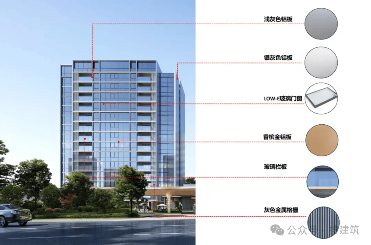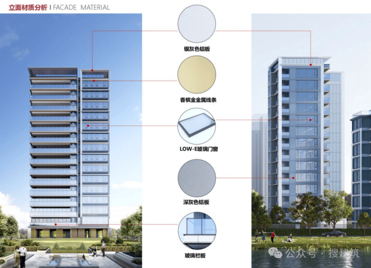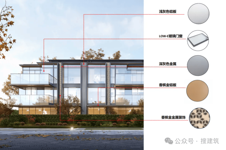 项目精选香槟金、银白、灰色三款色调,东南西北四面环绕360°全部铝板干挂设计,刷新了园区豪宅立面风格。