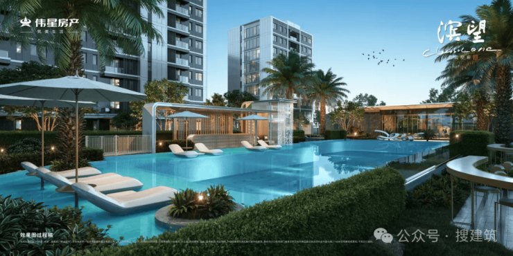 此项目打造城市级度假泳池+约5000方奢阔中央花园+多楼栋架空功能布局,建构起自然中静谧闲适的度假生活感。