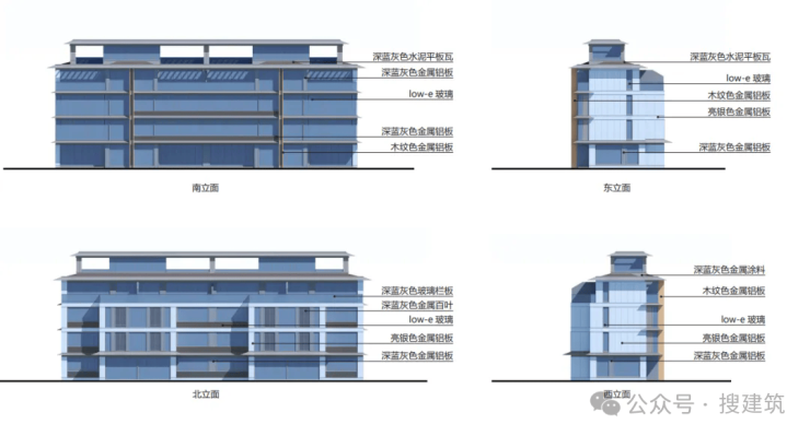 南立面为45°斜切双层铝板,玻璃幕墙最宽达约16m;北立面将窗台高度从90cm,降到60cm,加大窗墙比;南侧、东西山墙两侧的涂料率为0。