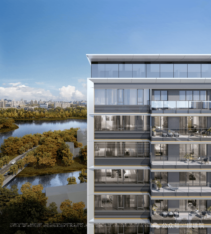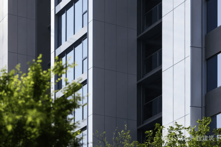 另外外立面还使用LOW-E灰玻璃与竖向机翼形圆弧铝板相交融,扩大透光面的同时进一步提升了户与户之间的隐私性。