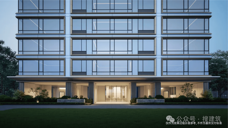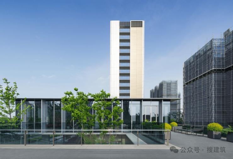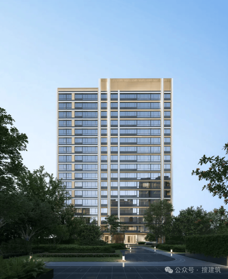 外立面采用浅色铝板、香槟金铝板及米白石材,带来精致米白色美感,搭配屋顶“流金塔冠”,充满昭示性与辨识度,轻盈、雅奢且秩序感十足。