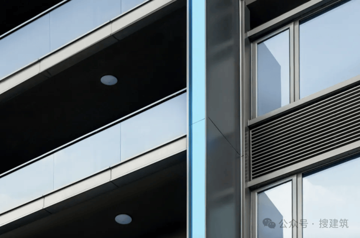 在常见银色、深灰、米色的外立面颜色中,加入了蓝色进行跳色点缀,让立面更为生动。