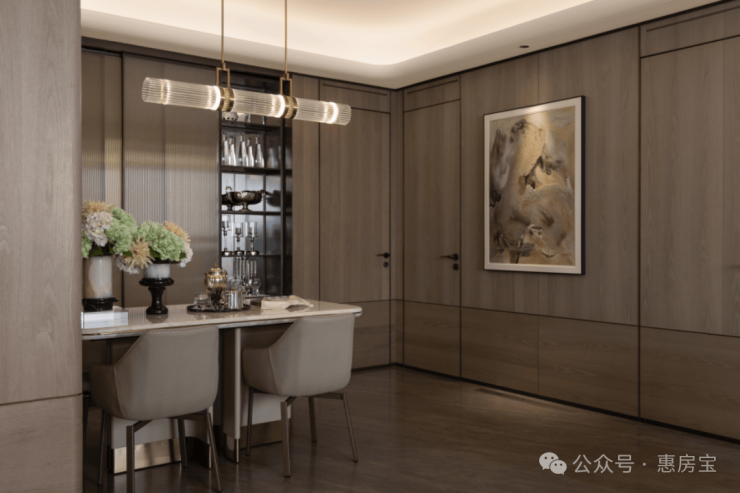 与常规新房室内没有门与墙的生硬拼凑感不同,江湾金茂府通过大量木饰面、隐藏门等细节,形成统一的设计语言,色彩与材质搭配协调统一,尽显整体美感!