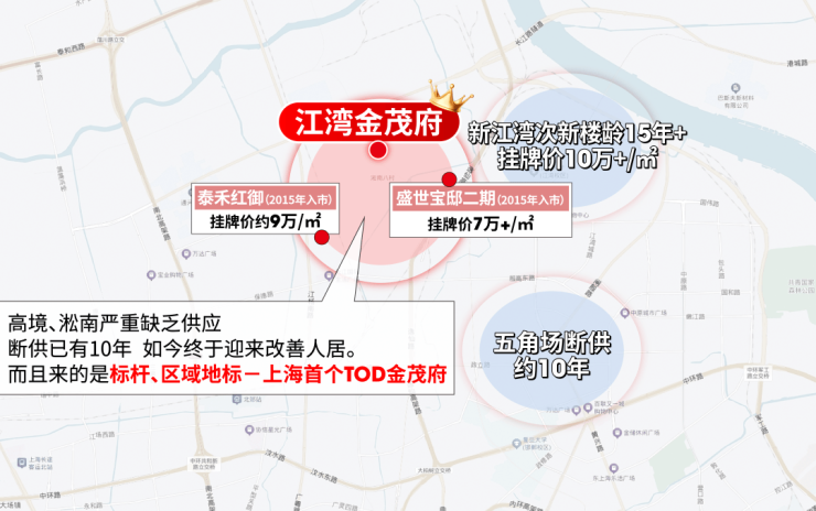 五角场同样如此,近10年断供;而新江湾次新房龄普遍15年+,挂牌价10万+/㎡,总价很高。久旱逢甘霖,这个片区终于等来了睽违已久的新供应!关键来的还是王炸——上海首座TOD金茂府,不仅将牢牢占据区域品质头把交椅,享受领先周边N代的产品体验。TOD综合项目的开发更将重塑板块格局,引领价值蜕变。