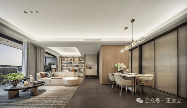 有一个细节大家可以在实地看样板间时留意:交付的内嵌式冰箱面板也是采用了木饰面,高级感扑面而来!吊顶和墙面采用大量弧线造型取代冰冷的直角,不仅以柔和的轮廓减少了磕碰隐患,更给空间注入了优雅与流动的气息甚至连主卧内卫生间墙面都做了弧线收边,精致感无处不在。地面通铺的大面积地砖,在弧线元素呼应下,延伸出很强的开阔感!