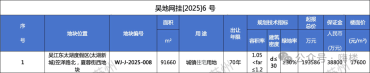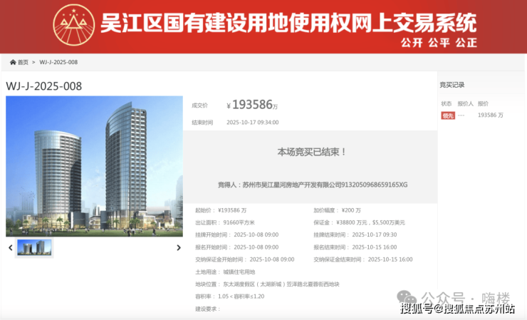 今天,苏州湾土拍结束,意料之中,最终由吴江城投(苏州市吴江星河房地产开发有限公司)底价19.36亿取得,成交楼面价:1.76万元/平方米;容积率1.2,预计打造洋房+叠墅产品。